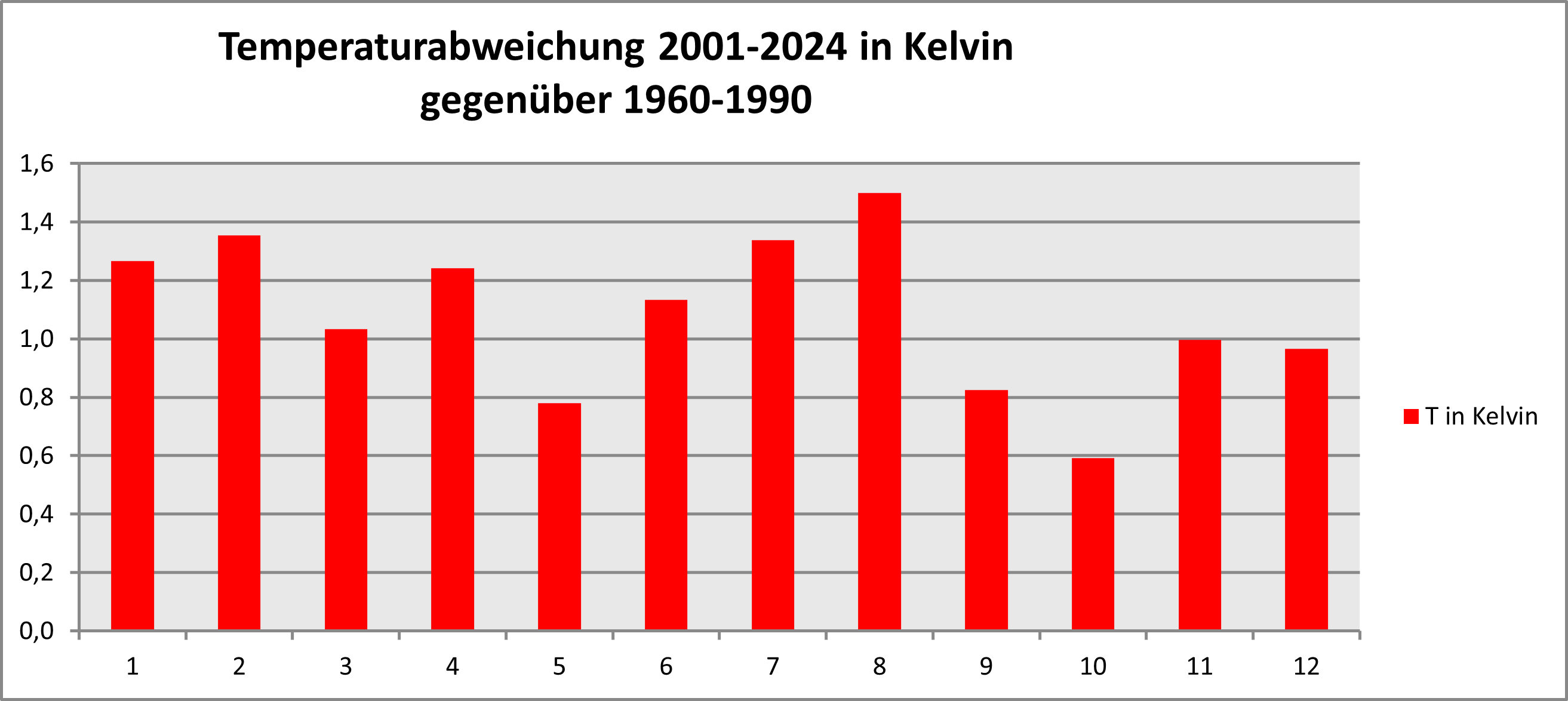 Die Mitteltemperatur der Jahre 2001-2024 liegt um 1,2