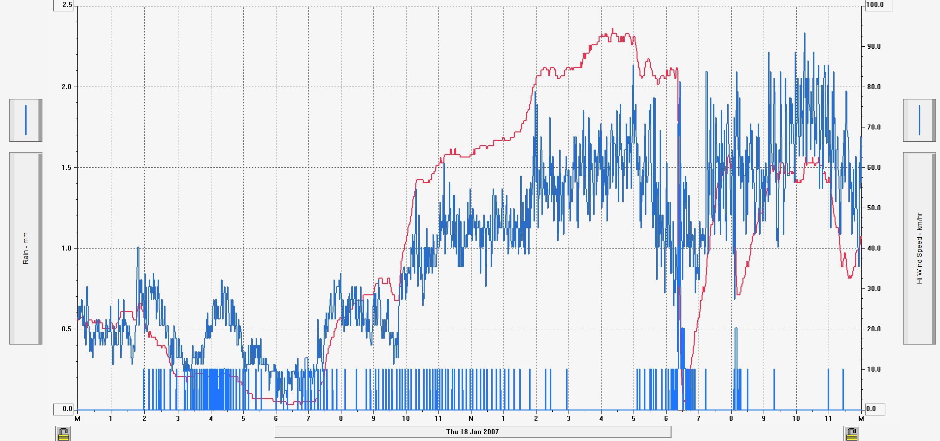 Die ersten Ausläufer der Warmfront erfassten Göttingen gegen 2 Uhr nachts. Die im Warmluftsektor eingeschlossene Luft tropischen Urspungs führte auf der einen Seite zu einem für Januar extremen Temperaturanstieg bis zum Nachmittag auf 13,6°C. Im 850 hPa-Niveau (etwa 1500 Meter Höhe) erreichte das Thermometer teilweise bis 10°C! Auf der anderen Seite enthielt die Luftmasse sehr viel Feuchtigkeit, die sich beim Aufgleiten über die kalte bodennahe Luftmasse gehoben wurde und zu ergiebigen Regenfällen führte: Am Diagramm ist dieser Verlauf sehr gut zu erkennen: Der Regen hörte erst auf, als die Hebung abgeschlossen und die Warmluft sich vollständig bis zum Boden durchgesetzt hatte (jede blaue Regensäule entspricht 0,25 mm).